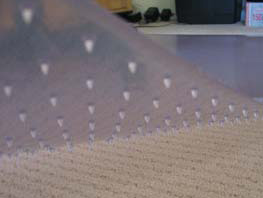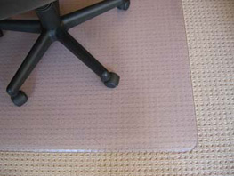 This deluxe-weight crystal color desk chair mat won't chip or curl and is non-flammable. Thousands of molded spikes on the back help to hold the mat on virtually any carpet surface.