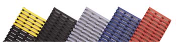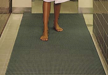 These modular square tiles easily snap together on-site to create custom configurations. Made from flexible plastic, these tiles are comfortable to walk on and provide a slip resistant surface. Beveled ramps and borders are used for the edges to minimize trip hazards. Use in locker room areas, pools, and anywhere slippage is a concern.